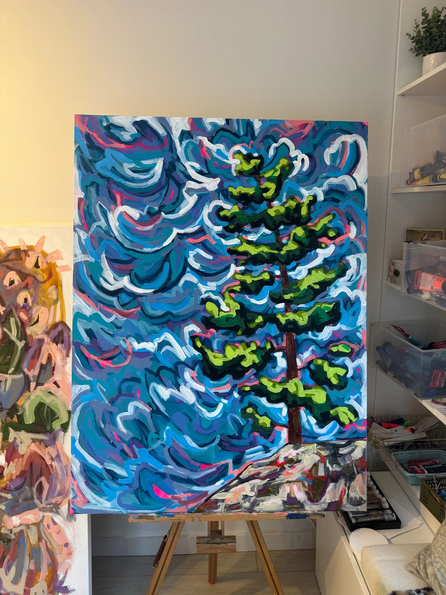 This painting to me represents the feeling of a good day ahead-When the big sky above is blue and you feel lifted but grounded at the same time. Acrylic on canvas.