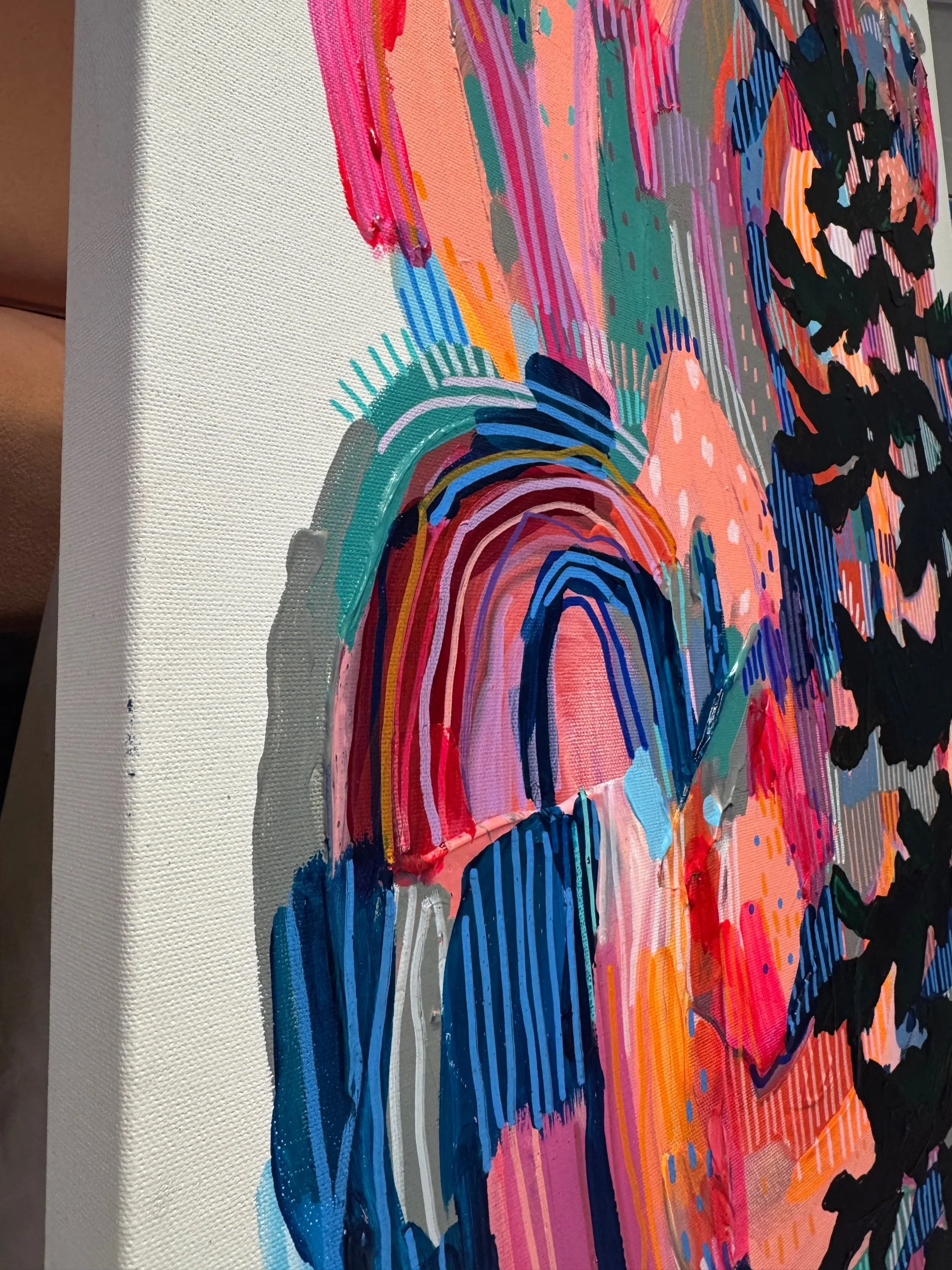 Negative space surrounds this vivid dreamscape to remind us there imare roots here. Acrylic and gloss on canvas create a scene that is wild and yet also serene, with a positive outlook on all that is to come.