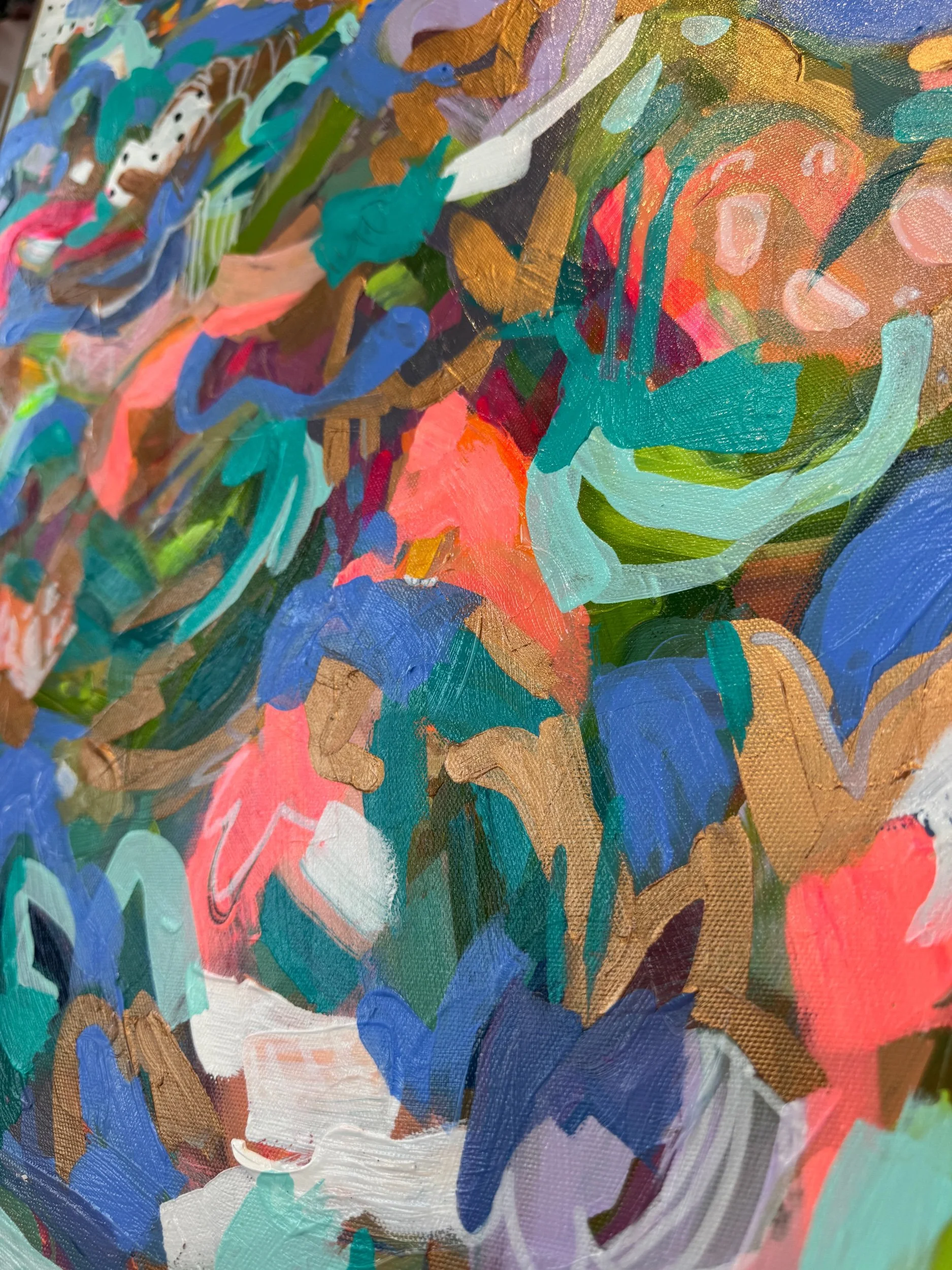 A bright and punchy painting about getting through the hardest days and knowing it’s all behind you. There are longer and brighter days ahead of blue Monday-we made it! Acrylic on recycled canvas, framed.
