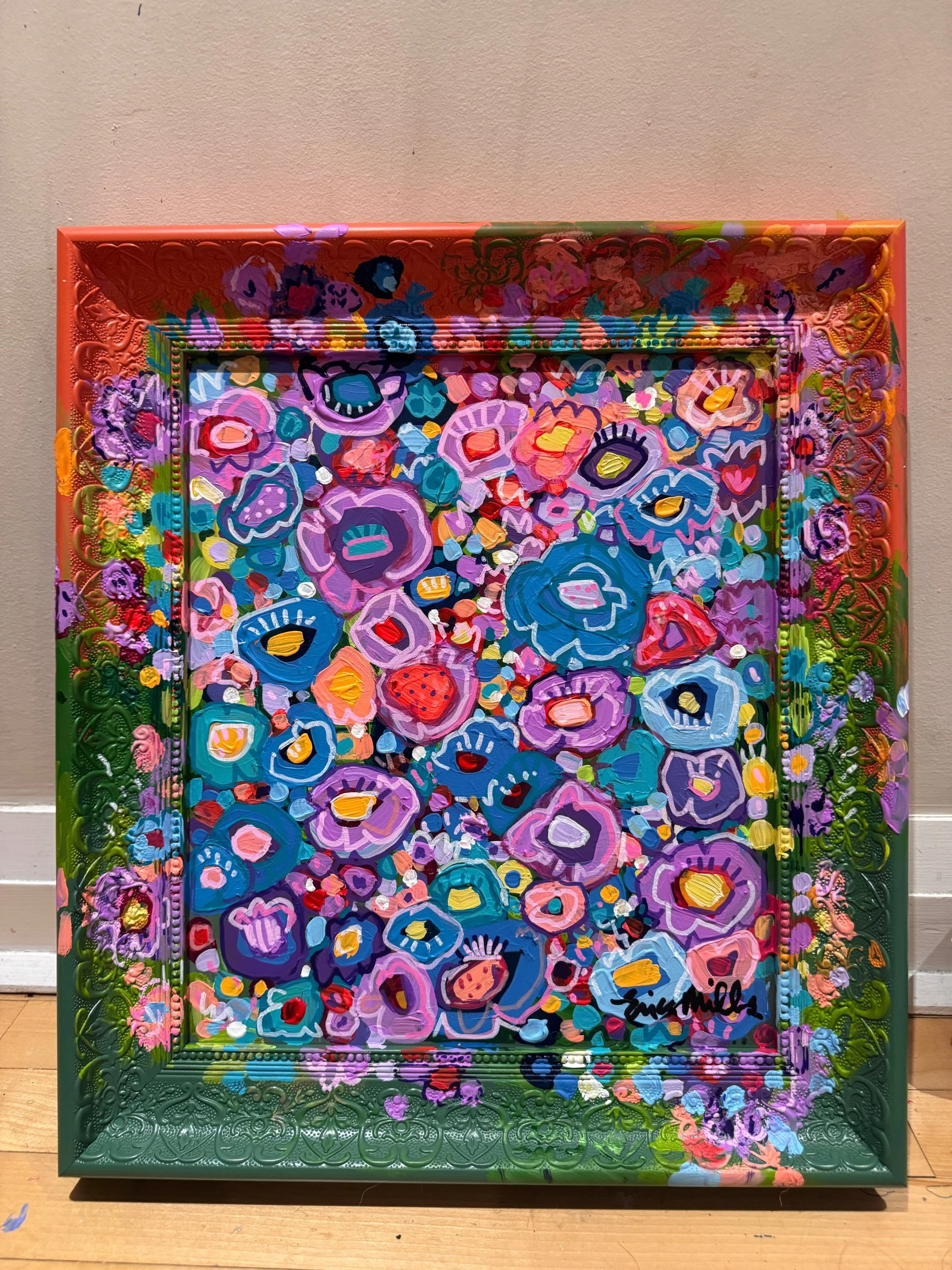A free spirited and joyful floral piece created with acrylic on recycled canvas and framed. I love how the flowers extend onto the ornate frame to create a unique look.
