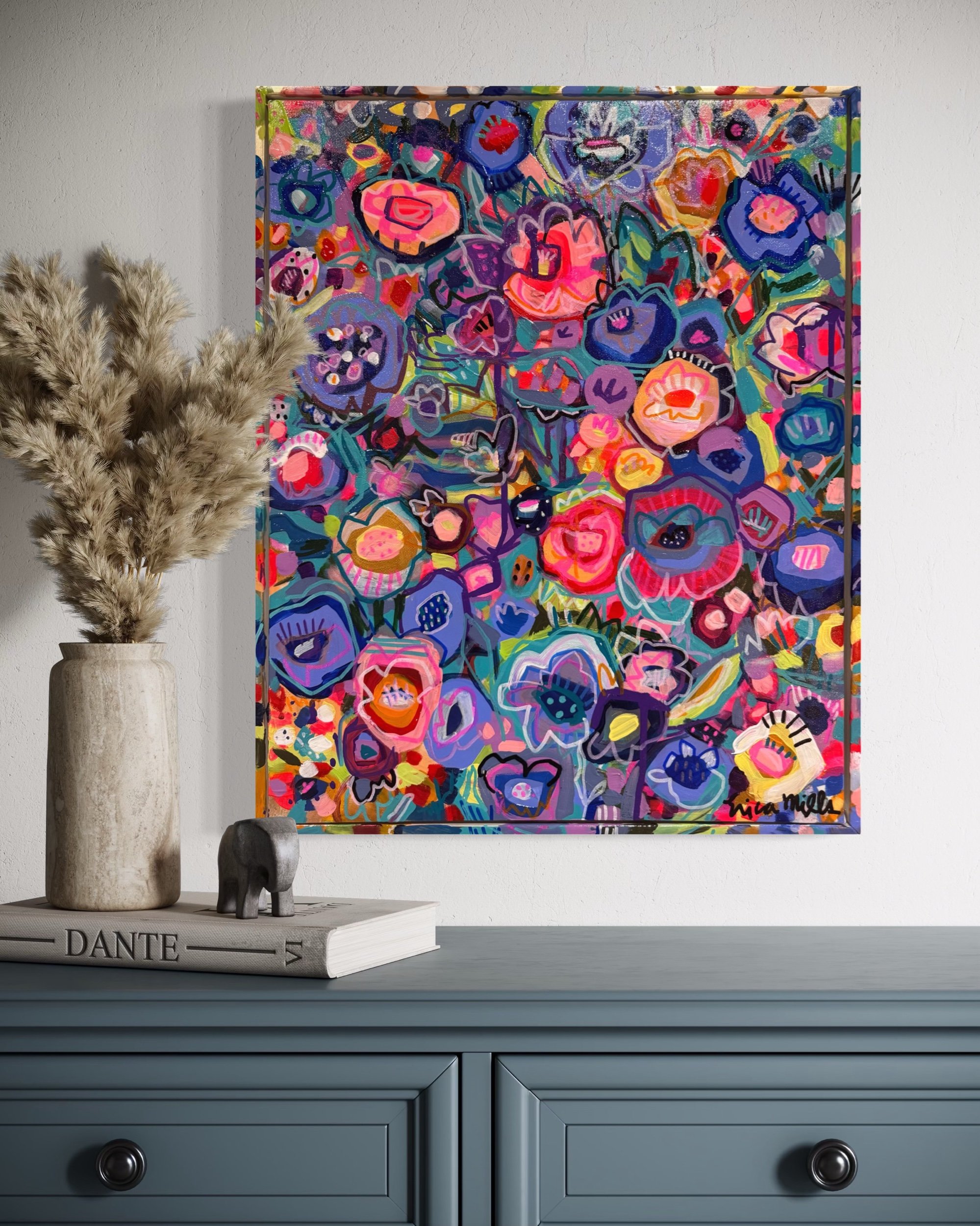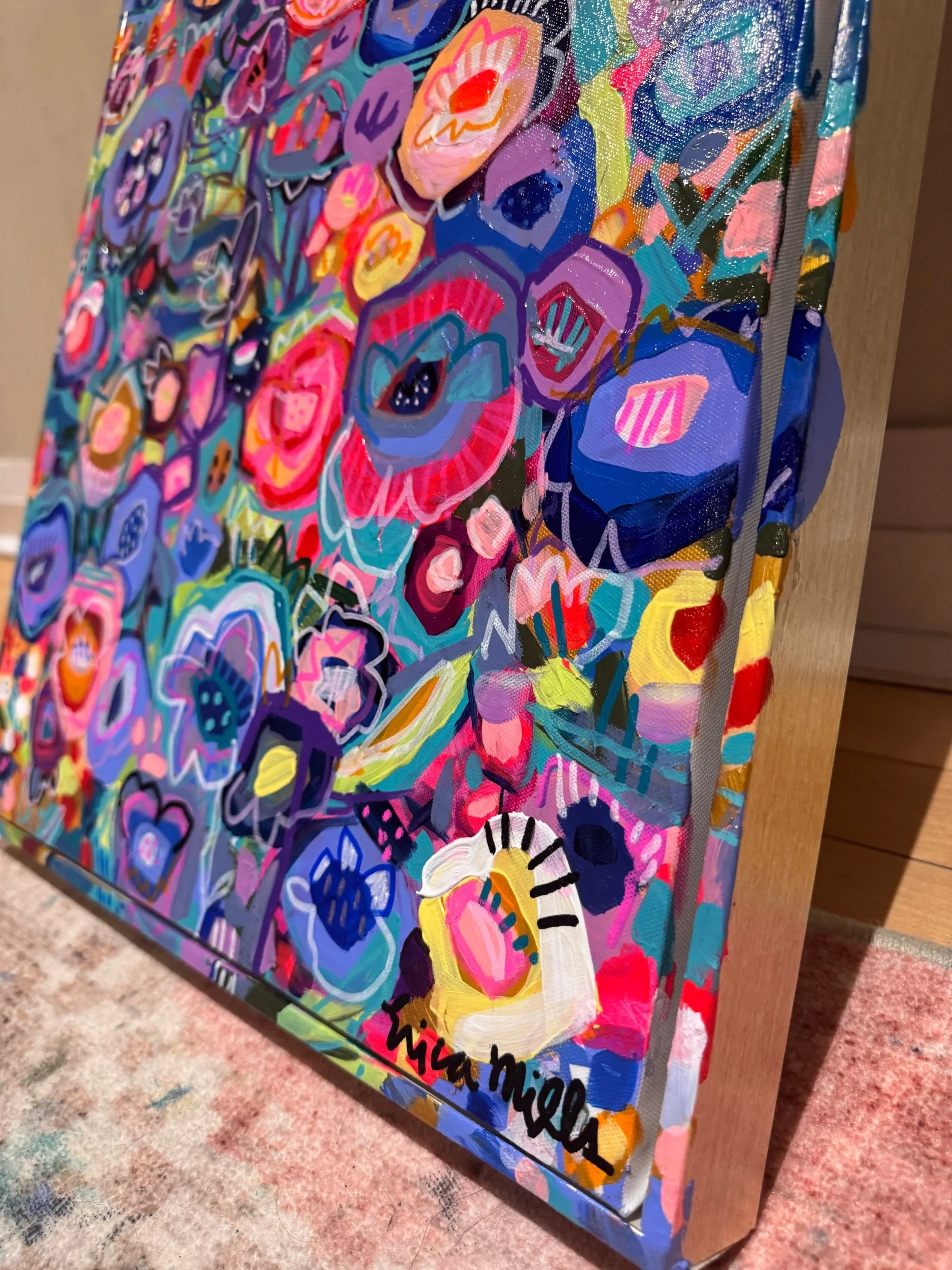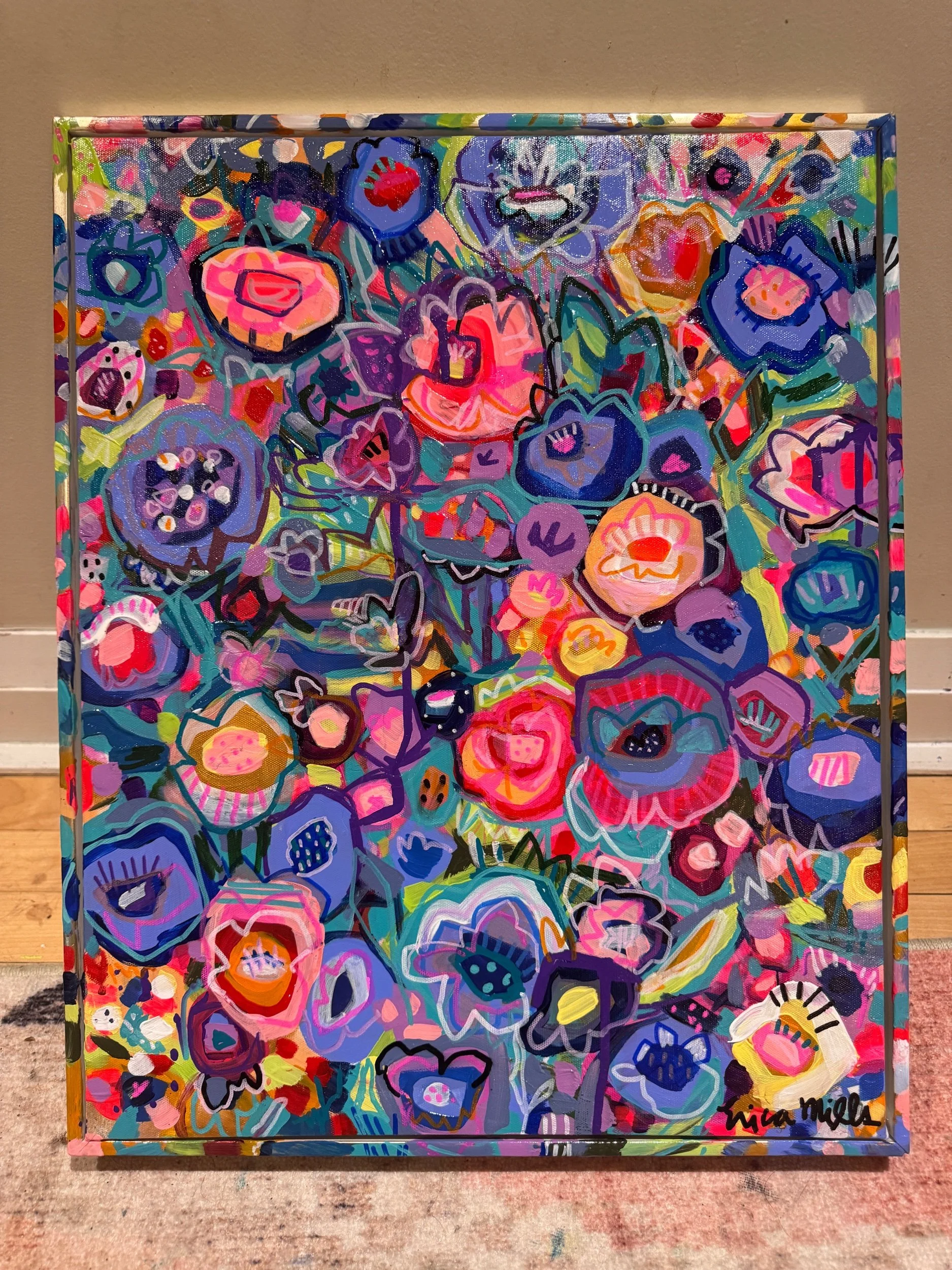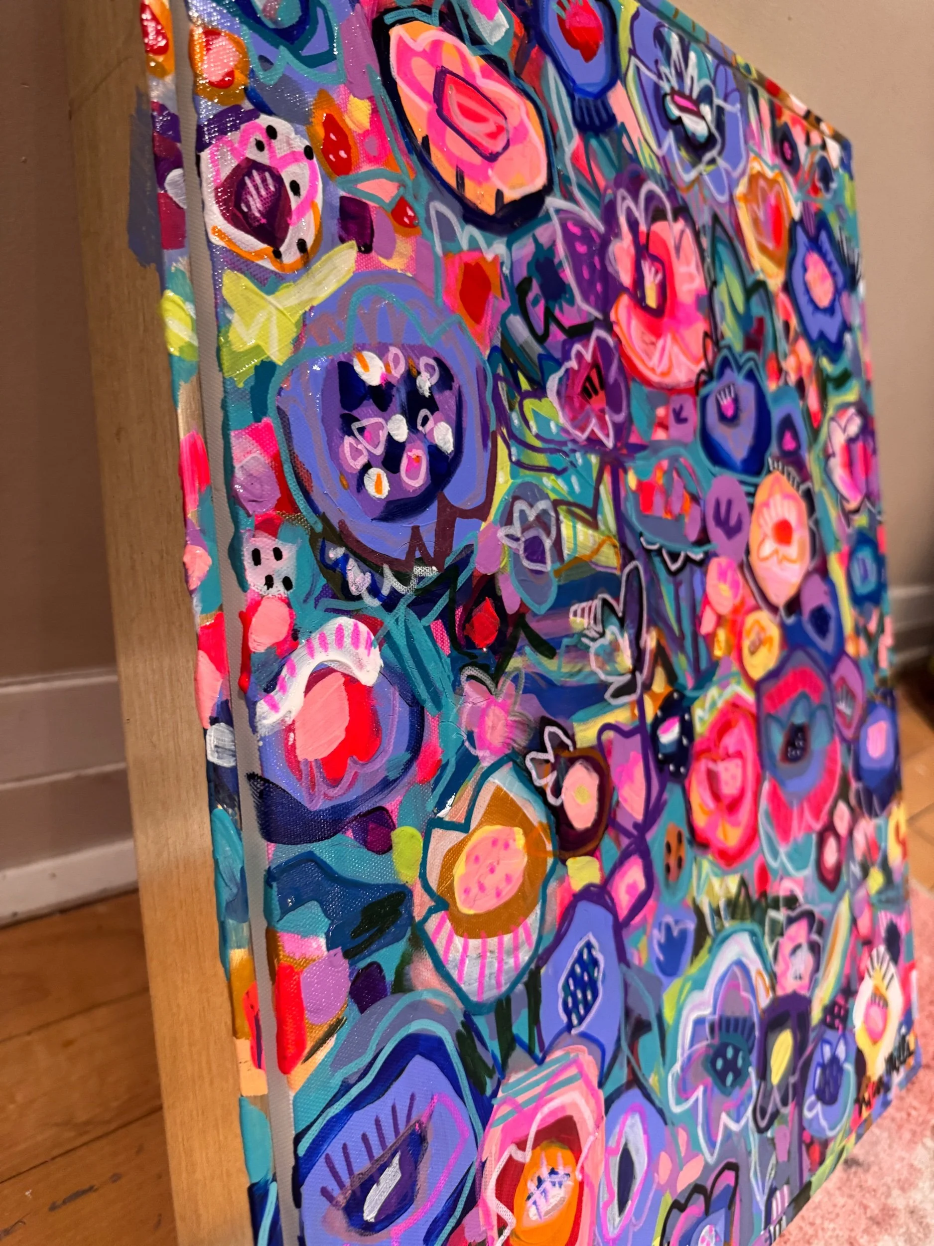 Flowers that will not constrain to the canvas and spread out onto the recycled and imperfect frame. Wild and untamed and full of fun. Acrylic on canvas.
