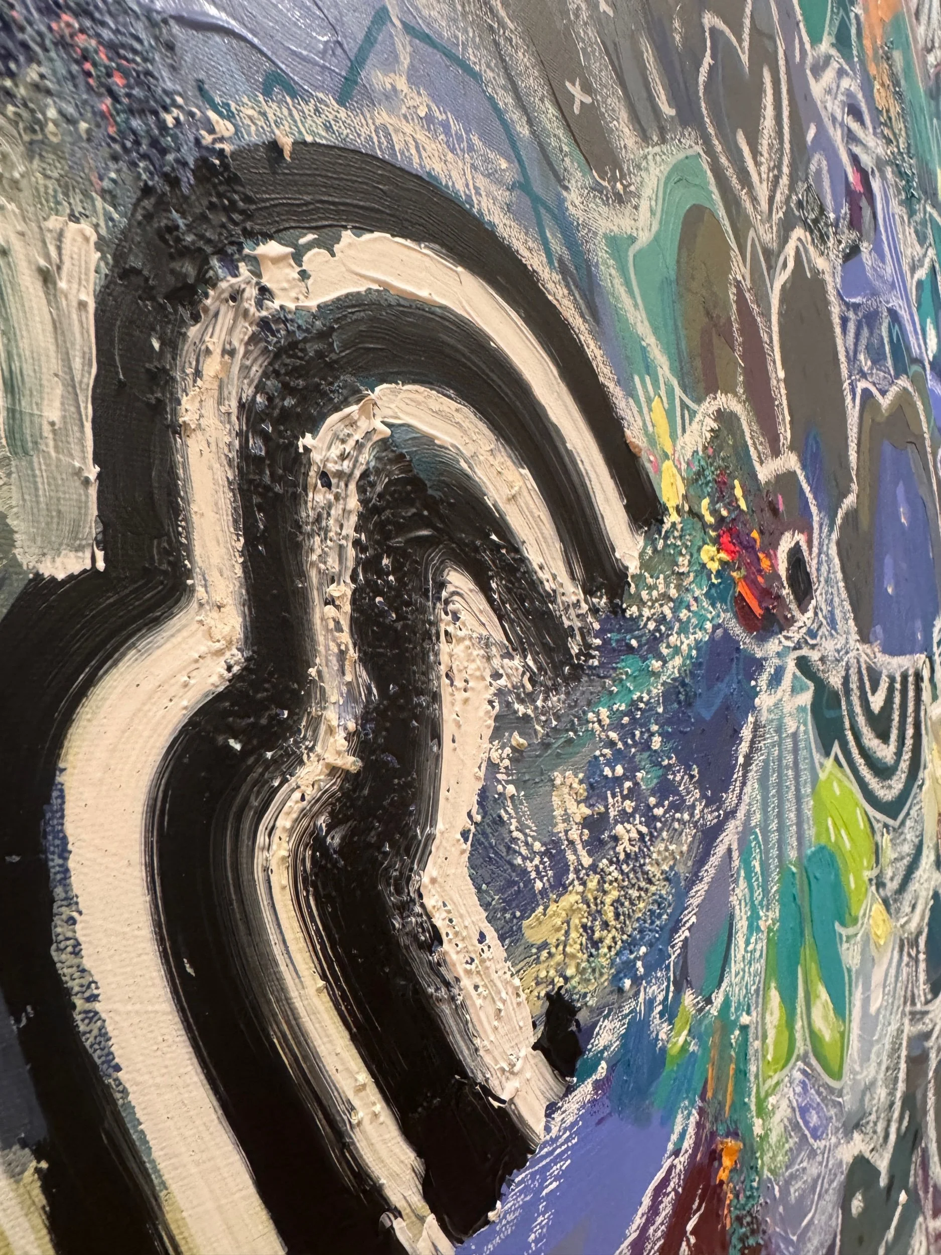 Perhaps I painted with more blues in honour of our blue jays…or blue skies, bluesy songs, my love’s eyes? Whatever the case you can get lost in the pleasant daydream of this detailed and textured piece. Created with alcohol ink, glass beads for texture, acrylic and oil stick. $1500