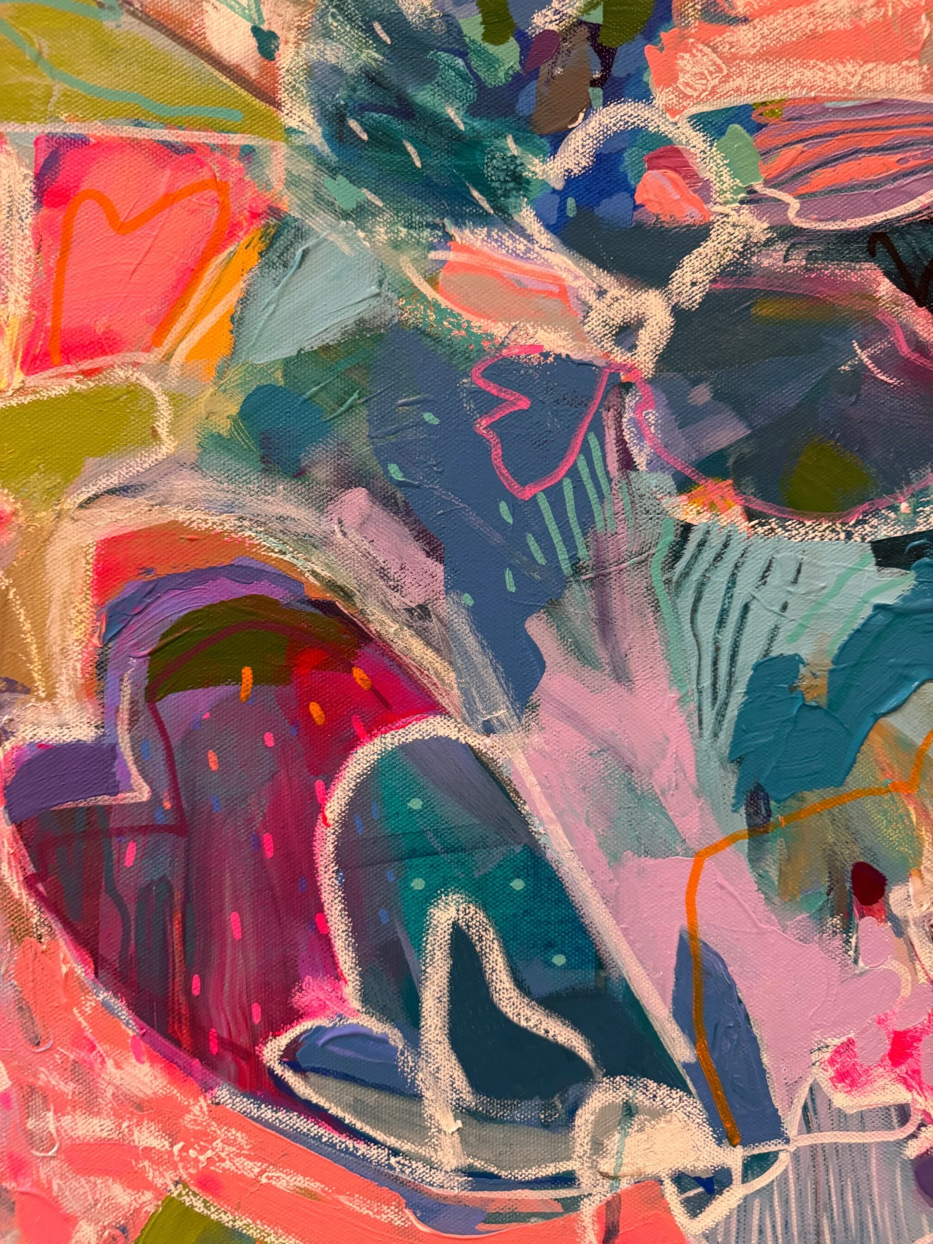 Hearts, flowers and organic shapes layered into an inticage and colourful composition. This was created mostly outside on glorious fall days and with an immense feeling of gratitude women into each brushstroke. Acrylic, alcohol ink and oil stick on canvas.